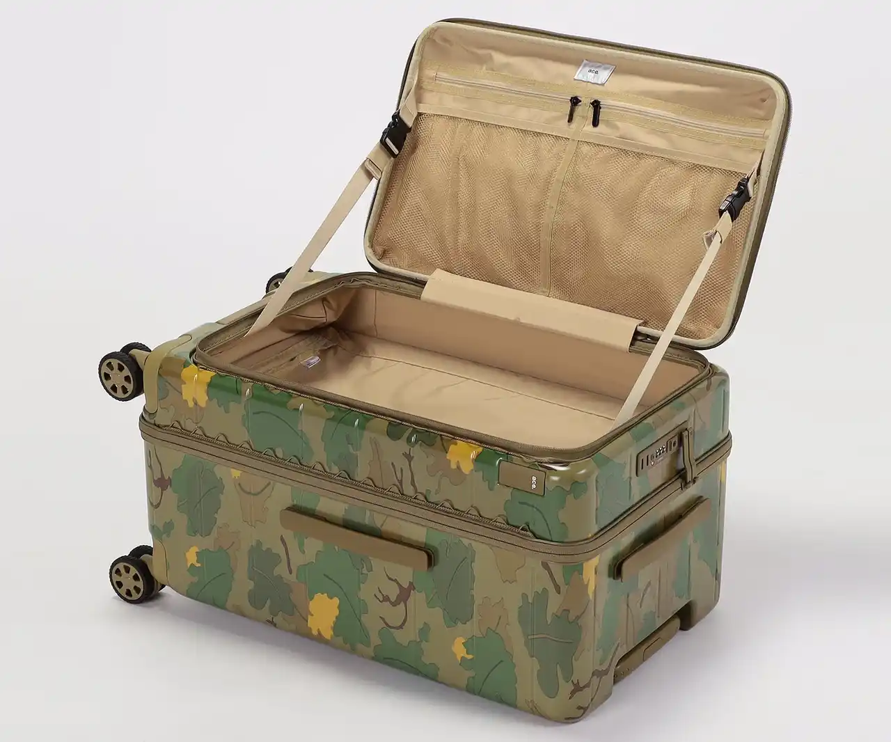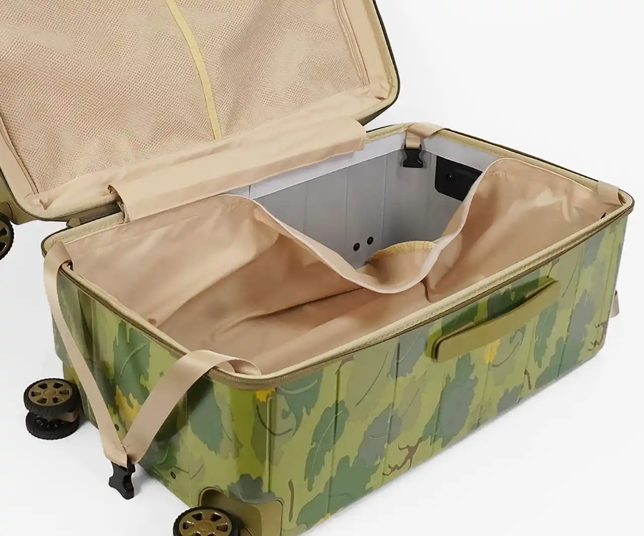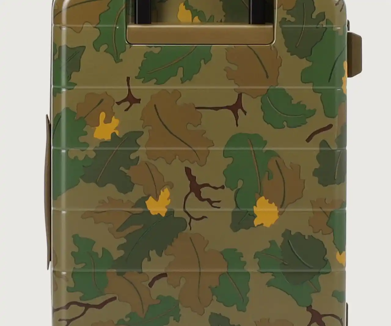 ・葉や雲をモチーフにした迷彩柄を採用。自然に溶け込み、空港で見つけやすいデザインです。 |