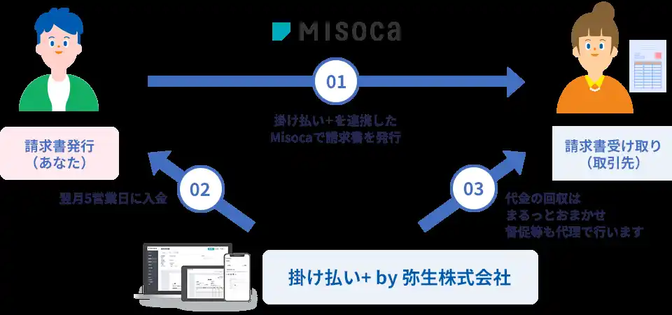 クラウド請求書作成ソフト「Misoca」で請求書を作成、送付することで、その後の管理はすべて「掛け払い+ by 弥生株式会社」が代行。万一の未入金時もプロが督促を担当します。 |