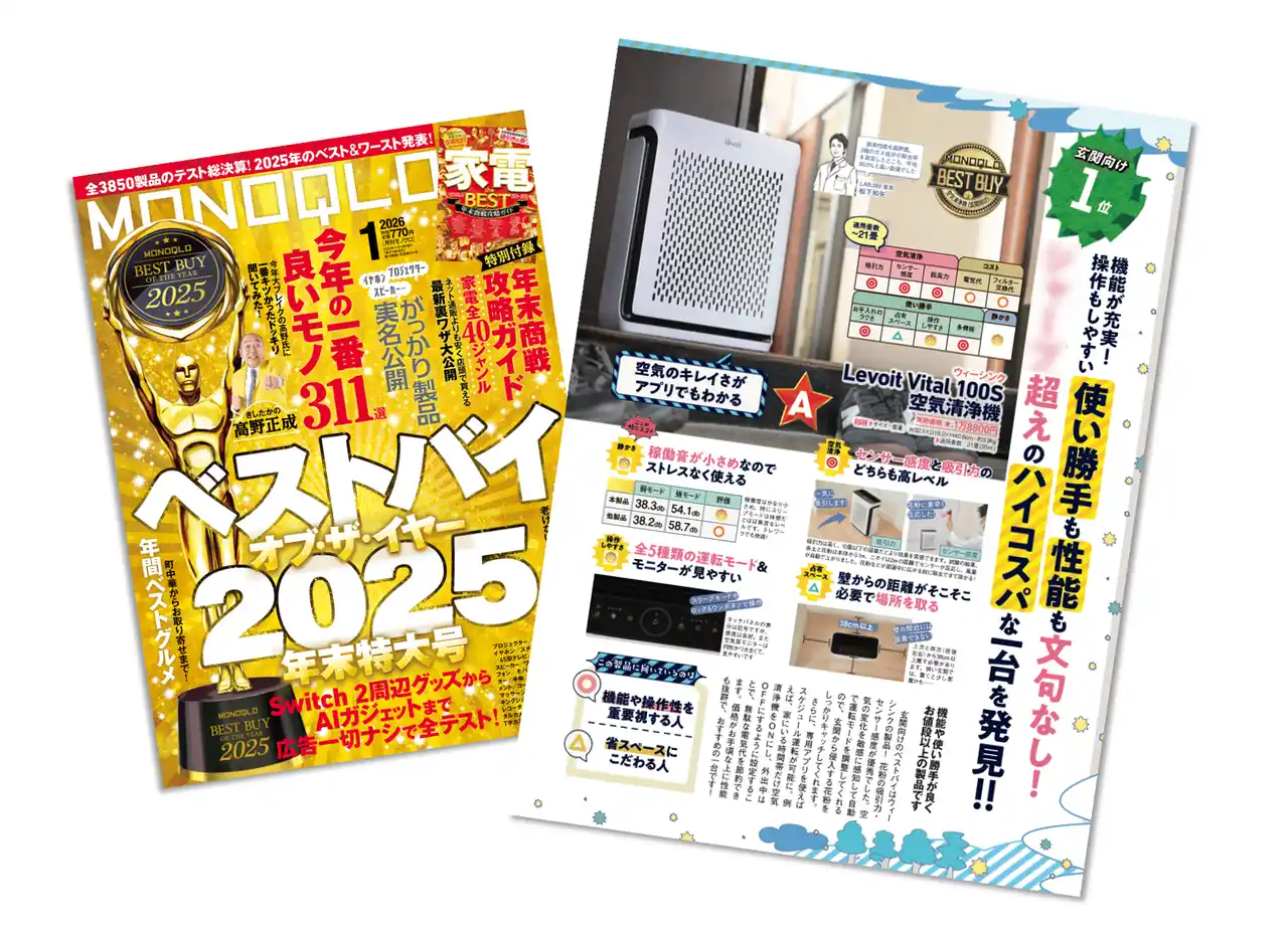 『MONOQLO』は、製品の性能や使い勝手を公平かつ厳密に評価することで知られる専門誌です。今回、「Levoit Vital 100S 空気清浄機」および「Levoit Vital 100S Pet 空気清浄機」は、吸引力やセンサー感度、メンテナンス性といった基本性能に加え、静音性や操作性の高さが総合的に評価されました。その結果、「空気清浄機(玄関向け)部門」において、「2025年年間総合ベストバイ」として選出されました。 |