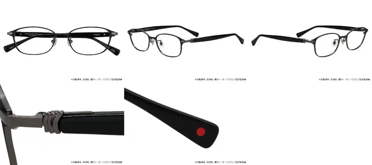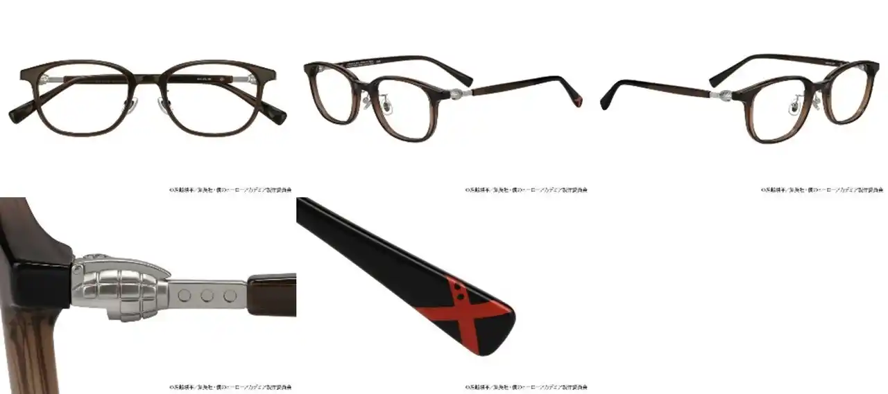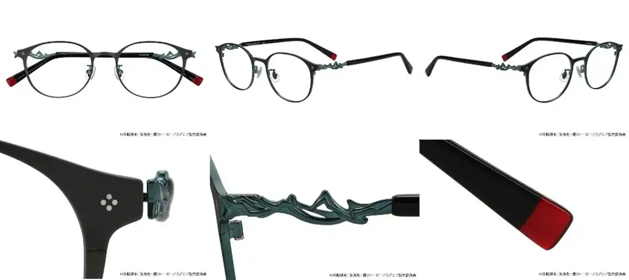ブリッジ、ヨロイ、テンプルに、コスチュームのディティールを落とし込みました。左右のモダンは轟の髪をイメージしたカラーと“個性”半冷半燃を表すモチーフをあしらったデザインです。 |