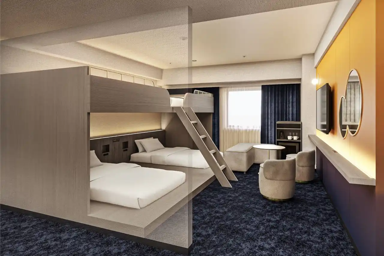 2段ベッドを備えた遊び心ある4名さま向け客室。お子さま連れのご家族やグループ旅行に最適です。空間を効率よく活かした開放感ある設計で、楽しく快適にお過ごしいただけます。 |