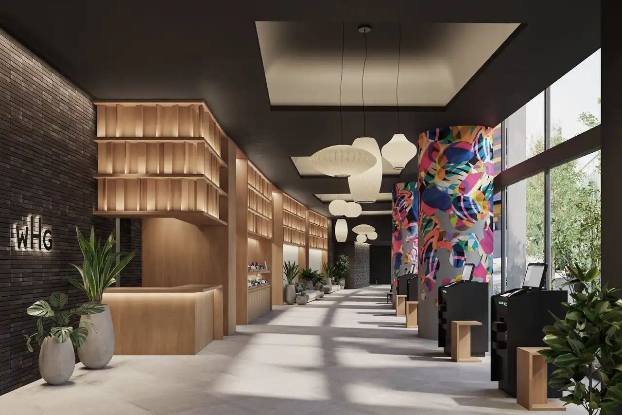 中洲屋台の温もりを感じさせる木質素材などを配し、地元の賑わいを演出する空間でお出迎えいたします。 |
