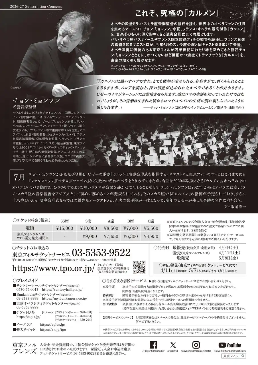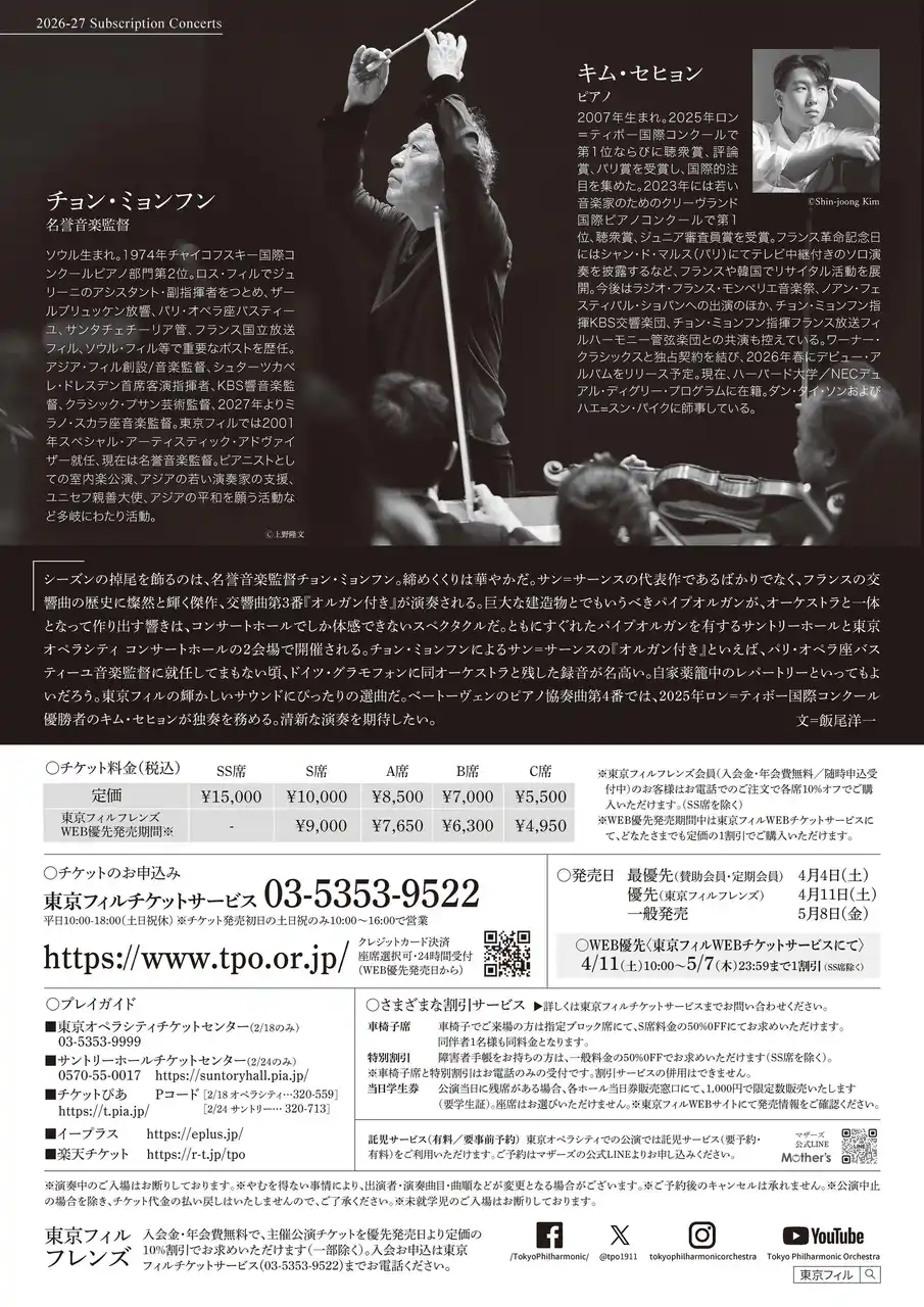 | ♪東京フィルフレンズ会員(入会金・年会費無料/随時入会受付中)にご入会いただきますと、お電話での購入で各公演とも10%オフでご購入いただけます(SS席を除く) | |||||||||