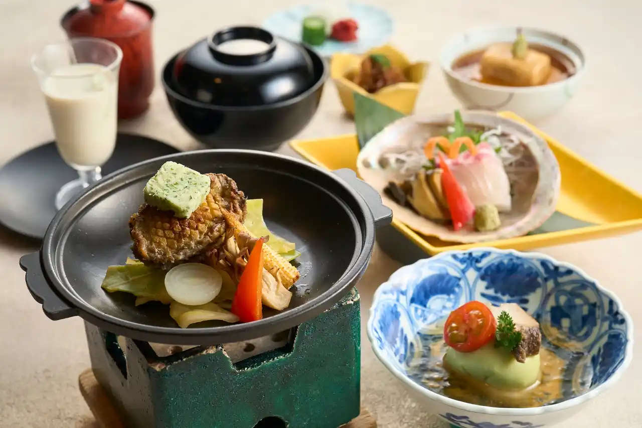 さらに、季節の移ろいを繊細に表現する「皿倉」では、鮑を存分に味わう鮑尽くし会席をご用意いたします。中でも、鮑の肝真丈は、丁寧に裏ごしした肝を真丈に仕立て、柔らかく蒸し上げた鮑を添えた一品です。鰹と昆布から引いた澄んだ出汁に、肝の濃厚な香りが加わり旨みがふわりと広がります。 |