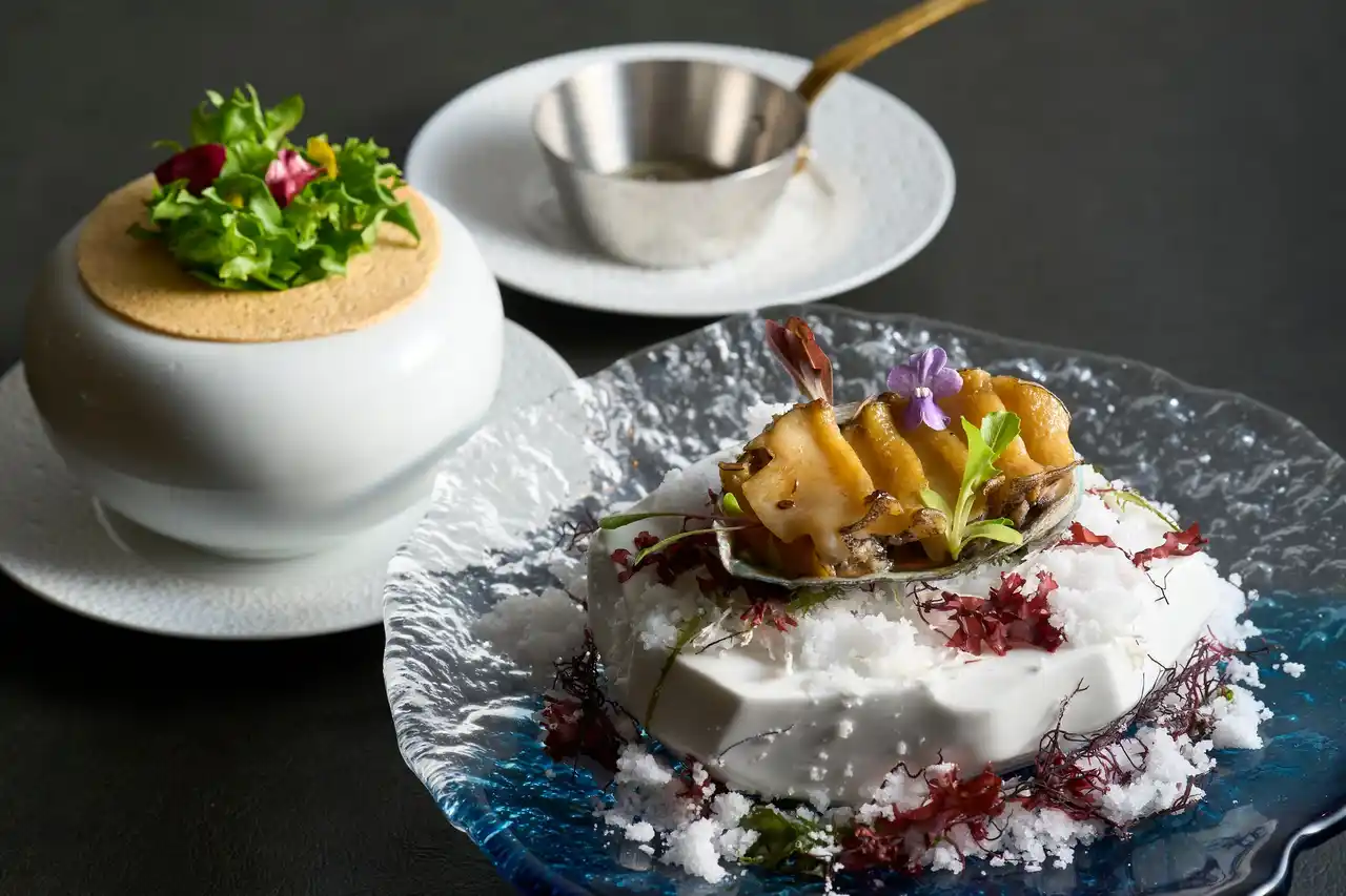 本フェアでは、鮑を主役に仕立てた贅沢なコースと素材の旨味を閉じ込めた珠玉の一皿を取り揃えます。鮑は、蒸す・焼く・揚げる、生食と、調理法によって食感や風味を変化させ、さまざまな表情を見せる食材です。 |