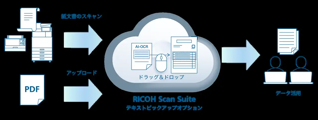 | 今回提供を開始する「RICOH Scan Suite テキストピックアップオプション」は、Webブラウザ上で利用できるアプリケーションです。リコー製複合機や業務用イメージスキャナー「RICOH fi Series」でスキャンした紙文書、またはPCから取り込んだPDFファイルなどから、文字列や表組み情報をテキスト形式で抽出できるため、Excel などへの転記作業を効率化します。例えば、仕入先から受領した紙またはPDF形式の見積書から必要な情報を抽出し、自社で用意しているExcelの見積書フォーマットへ転記するなど、業務負荷の軽減に活用いただけます。 | |||