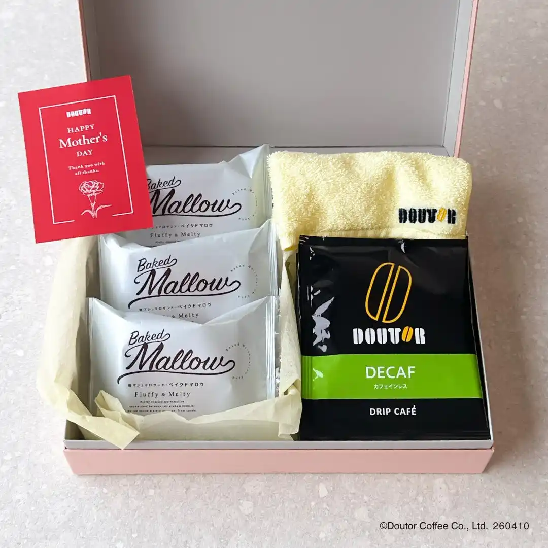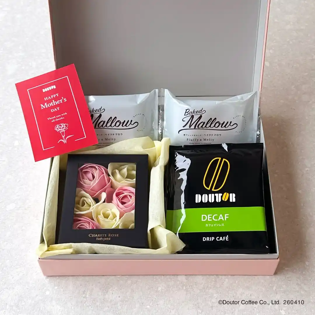 人気のコーヒー「マイルドブレンド」と、カフェインが気になる方にも安心な「カフェインレス」の2種類ドリップカフェから選べます。「ソープフラワー」は飾って楽しむだけでなく、お風呂に浮かべて香りとともにくつろぎの時間を演出。やわらかな肌触りと高い吸水性を備えた今治タオルの「DOUTORオリジナル刺繍入りハンドタオル」は、毎日心地よく使えます。 特別感のあるスイーツ、焼きマシュマロサンド「ベイクドマロウ」は、温めても冷やしても楽しめます。 メッセージカードは定型文の「有り・無し」を選べ、手書きで直接感謝の気持ちを添えることも可能です。見た目も華やかで、開けた瞬間に笑顔が広がるバラエティ豊かなセットです。 |
