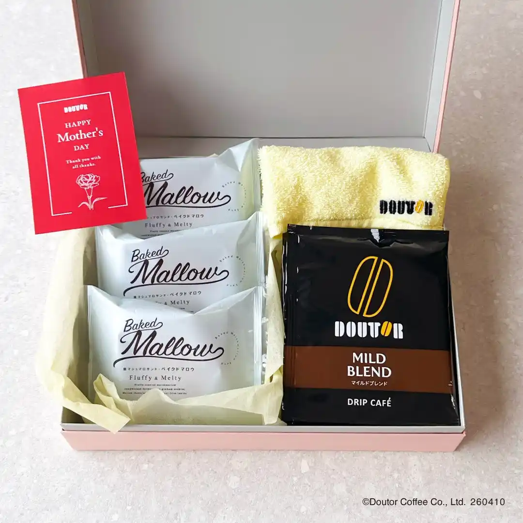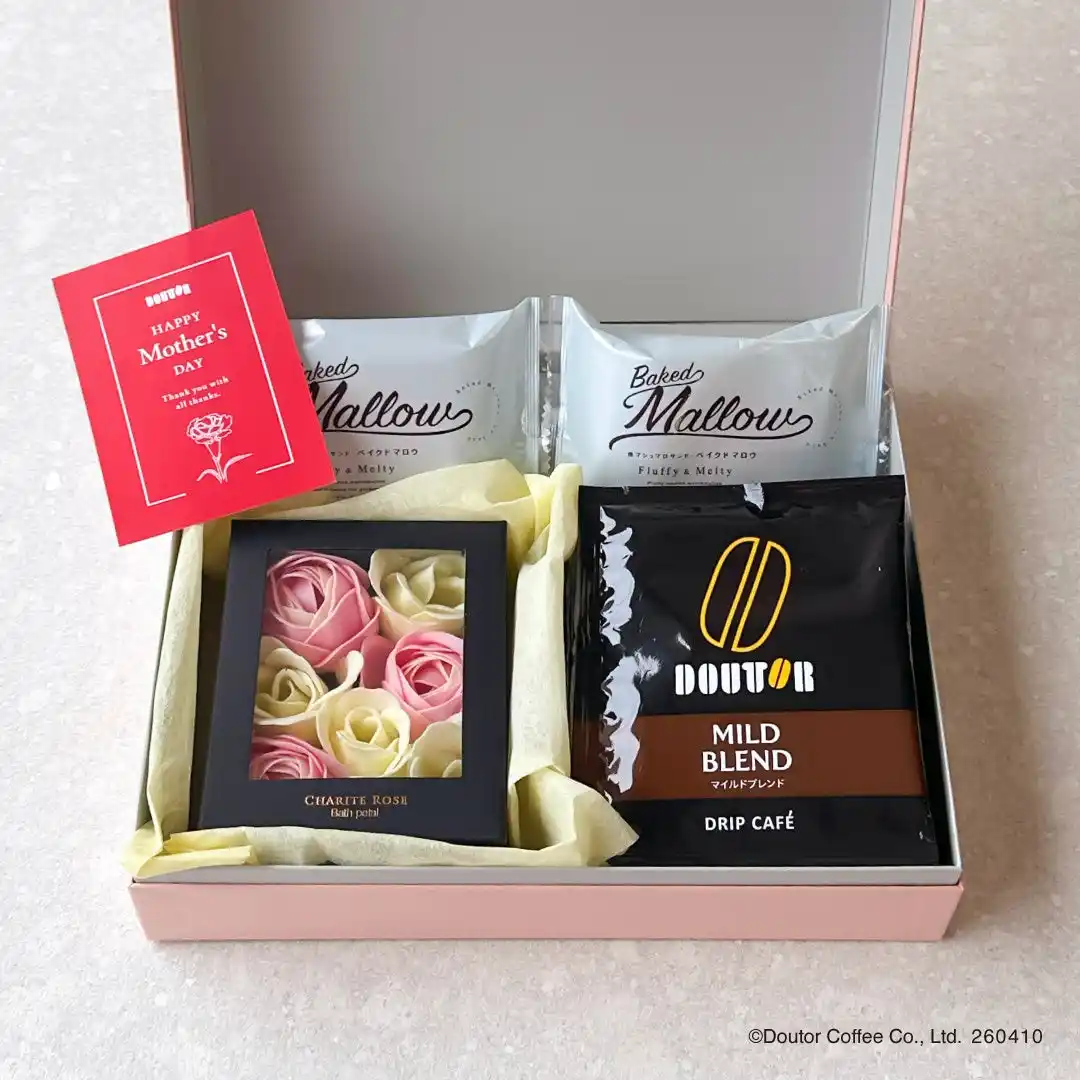 株式会社ドトールコーヒー(本社:東京都渋谷区/代表取締役社長:星野 正則)は、2026年4月10日より、公式通販サイト「ドトール オンラインショップ」にて、ほっとひとときを贈る「選べる母の日ギフト」の予約を開始いたします。ドリップカフェと人気のスイーツ、オリジナルハンドタオルやソープフラワーを詰め合わせた、母の日限定の特別なギフトです。贈る方の好みに合わせて組み合わせを選べる、心まであたたまる母の日ギフト。「ありがとう」と「ほっとする時間」を一緒に贈りませんか。 |