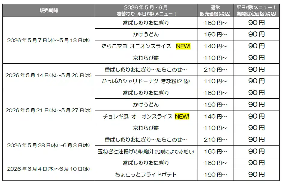 『たらこマヨ オニオンスライス』『チョレギ風 オニオンスライス』 『香ばし炙りおにぎり~たらこのせ~』『香ばし炙りおにぎり』『かけうどん』『玉ねぎと油揚げの味噌汁』『ちょこっとフライドポテト』『かっぱのシャリドーナツ きな粉(2個)』『京わらび餅』 |