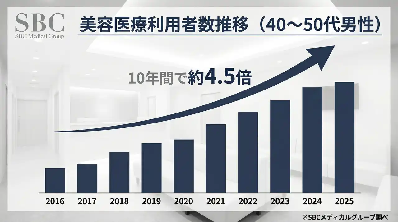湘南美容クリニックをはじめ、国内外の医療機関に経営支援を行うSBCメディカルグループホールディングス(所在地:米国カリフォルニア州、CEO:相川 佳之、以下「SBC」)は、男性の美容医療に関する動向調査を実施しました。その結果、40~50代のミドル層男性における美容医療の利用者数が過去10年間で約4.5倍に増加したほか、20代と40~50代では人気メニューに明確な違いが見られ、若年層は「肌質改善」、ミドル層は「アンチエイジング」への関心が高いことが明らかになりました。