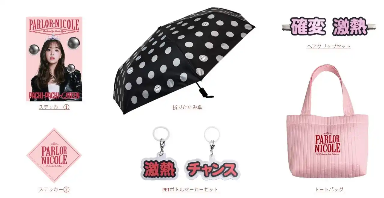 | パーラーのオープンに際し、藤田さんは「パチパチクイーンの藤田ニコルです。『PARLOR NICOLE』へようこそ。ここは、パチンコ愛をぎゅっと詰め込んだ私の“秘密基地”のような空間です。空間にあるものはすべて私がプロデュースしているので、ぜひゆっくり楽しんでください。今回、トートバッグや折りたたみ傘などパーラーニコルのオリジナルグッズも作らせていただきました。みなさんに『PARLOR NICOLE』を楽しんでもらえたら嬉しいです!」とコメントを寄せました。 | ||||