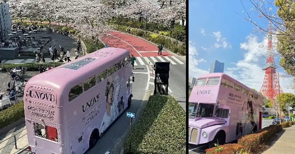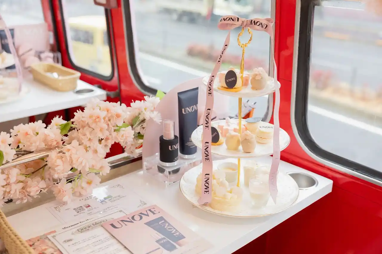 本イベントでは、桜色に装飾された特別仕様のアフタヌーンティーバスを舞台に、UNOVEのブランド世界観を体験いただける空間を創出しました。 |