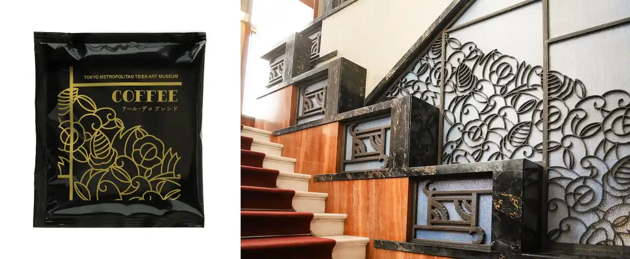 アール・デコの旧朝香宮邸をイメージした「アール・デコ ブレンド」は、エクアドル産、イエメン産、コスタリカ産、エルサルバドル産の4種の豆を中煎りしており、コクと酸味のバランスが綺麗な余韻を残す、印象的な味わいです。以前より販売していましたが、今回はパッケージの色を変更して装い新たに再登場します。パッケージデザインは、第一階段の鉄製装飾です。 |