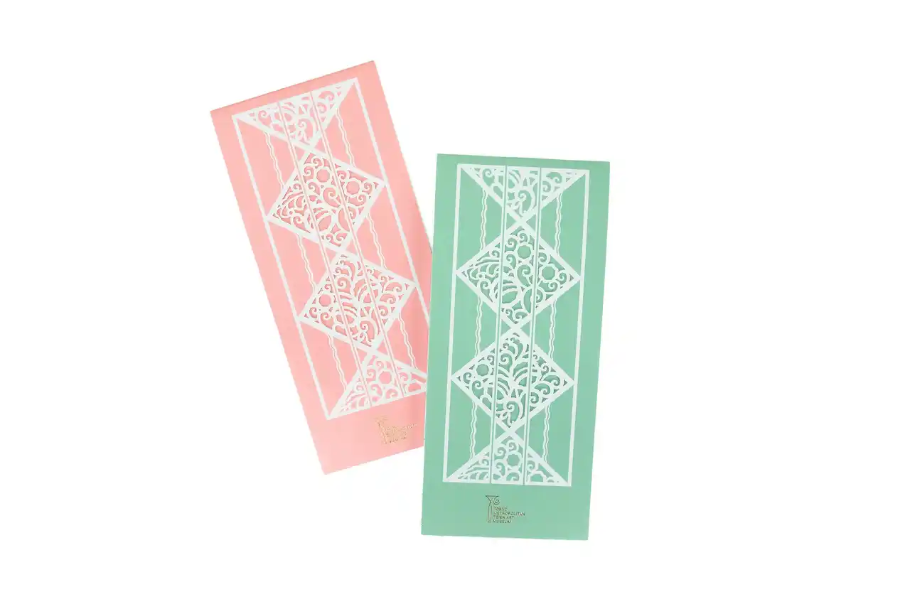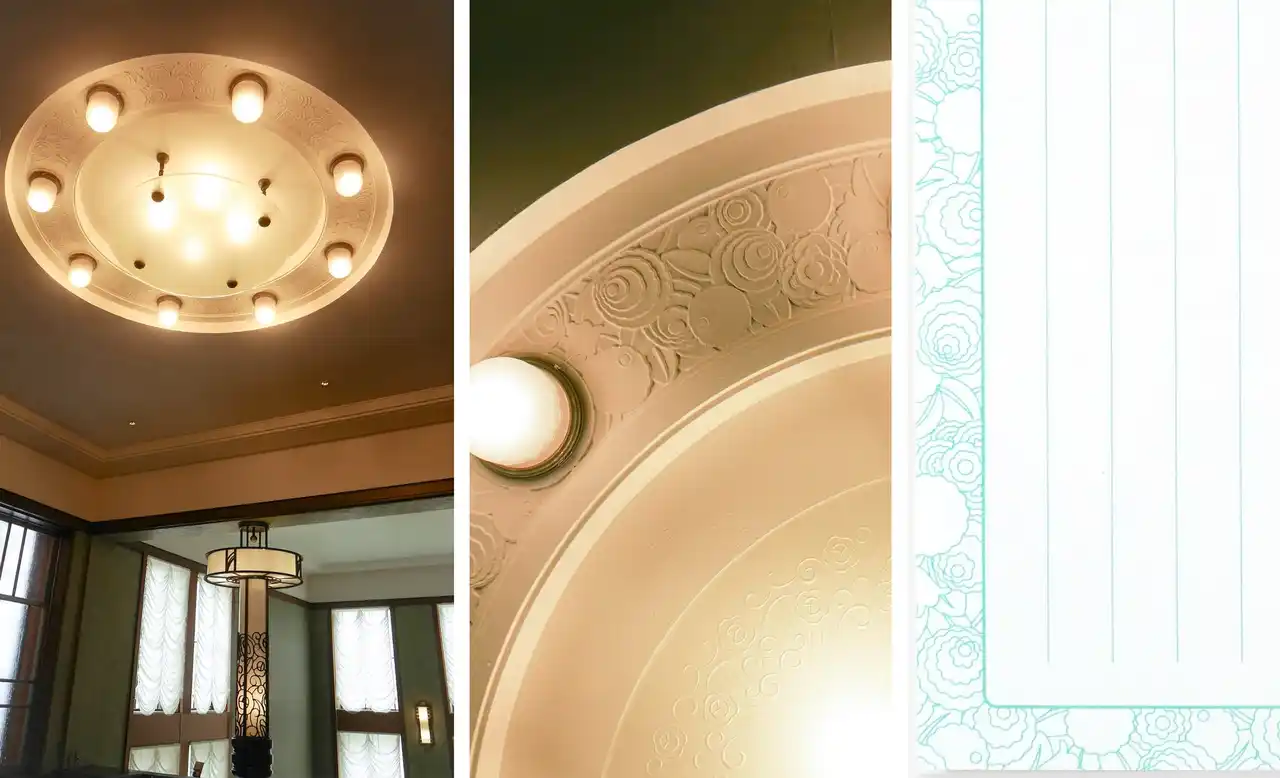 一筆箋の中紙の文様は2種。大客室マントルピース装飾とニ階広間の照明の装飾を使用しました。こちらもあまりメインで紹介される機会が少ない部分ですが、館内のこだわった装飾を知るきっかけになればと考えました。また、紙質は東京都庭園美術館のイメージに合うよう、白く厚みのある紙を採用しています。 |
