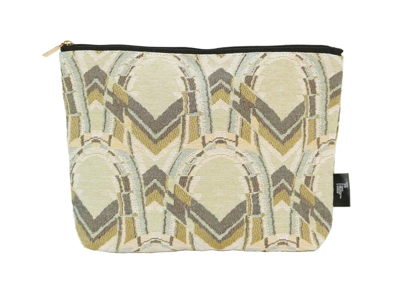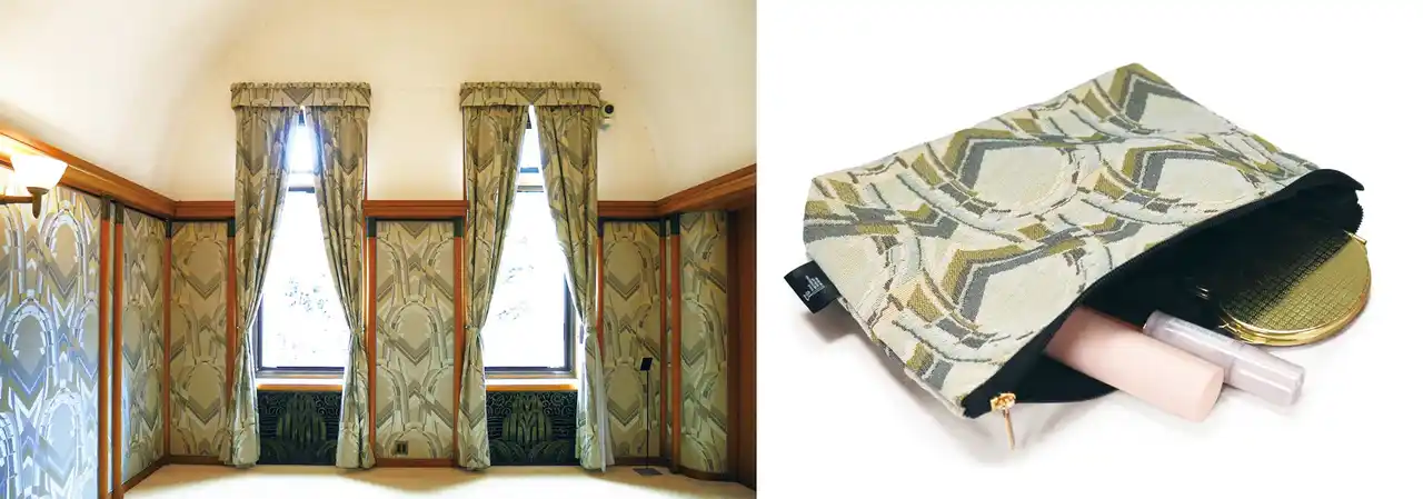 その壁布のデザインを緻密なジャガード織で表現したポーチです。邸内意匠を、日常的に持ち歩けるアイテムにしました。 |