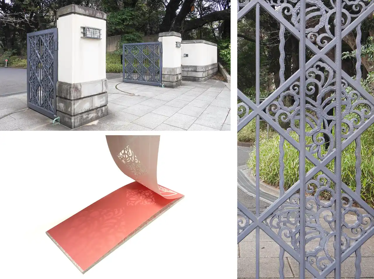旧朝香宮邸は敷地内の建造物の複数が重要文化財に登録されています。その中でも訪れた人が最初に目にする重要文化財建造物である正門の意匠を表紙に使用した一筆箋です。つい意識せずに通り過ぎてしまいがちな正門ですが、門扉にはオリジナルの意匠を使用しており、繊細な細工で表現されています。グッズを通して、普段注視しない部分にも目を向けてほしいと思い、表紙に採用しました。表紙は正門意匠の形にレーザーカット加工を施し、光に透かすと影が落ち、その美しい文様が浮き上がるよう工夫しています。 |