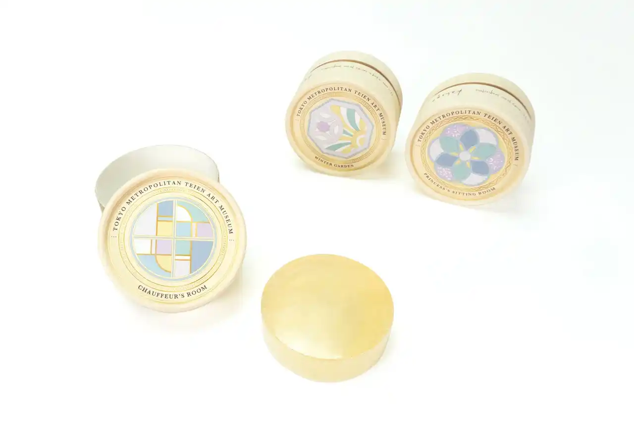 自然乾燥と手磨きを90日間繰り返して作られた枠練り石鹸「kahogo soap(カホゴソープ)」の東京都庭園美術館限定デザイン箱です。丸い箱の形状を生かし、家丁・運転手室窓、ウインターガーデン金物装飾、姫宮居間照明まわりの邸内意匠をあしらいました。 |
