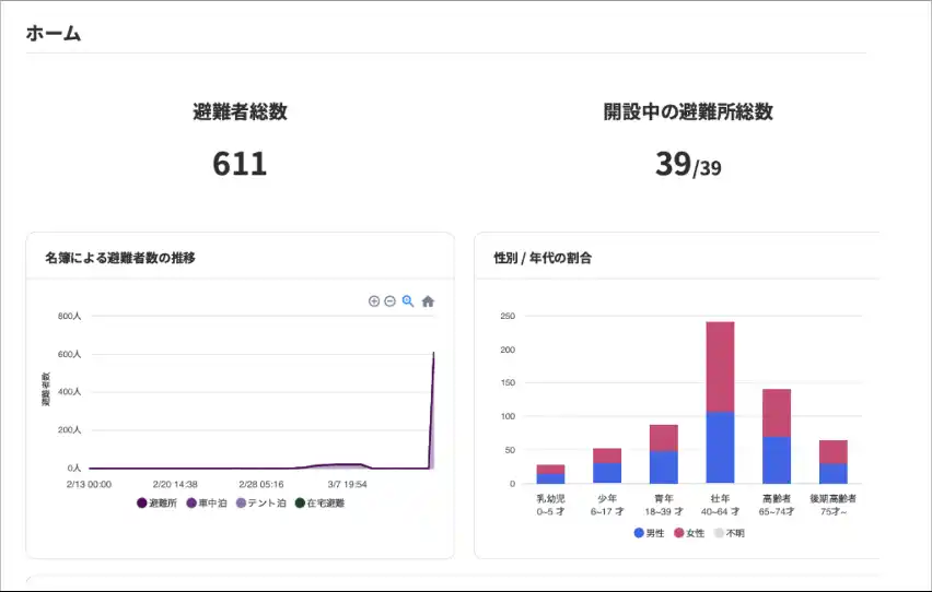 避難所の入所者数と混雑状況は、リアルタイムで管理画面とマップに反映されるため、自治体職員や災害対策本部は追加作業なく状況を把握できます。住民も適切な避難先を選択でき、スムーズな避難を支援します。 |