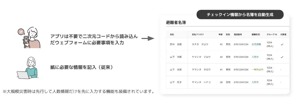 従来の紙の避難者名簿への記入に加え、スマートフォンで二次元コードを読み取りWebフォームから情報を入力する方式を体験 |