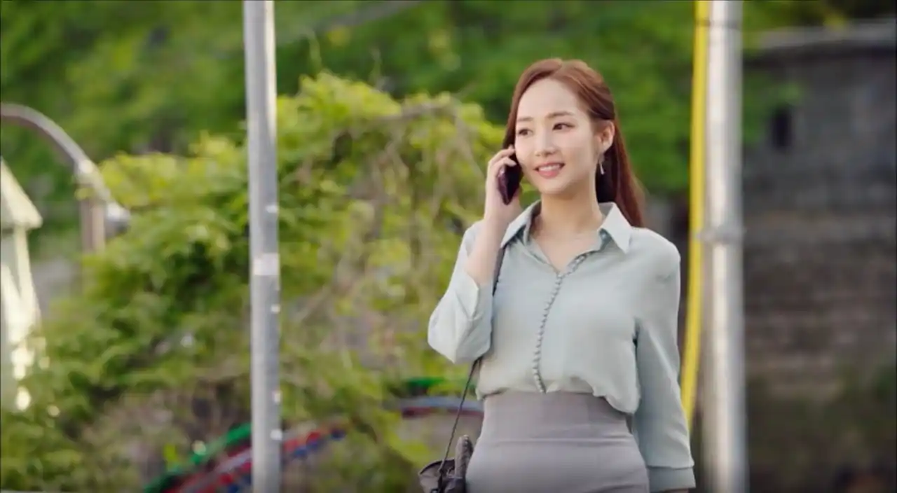 オフィスファッションの金字塔とされるミソのスタイル。「とろみブラウス×ハイウエストのタイトスカート」という鉄板の組み合わせは、スタイルを最大限に美しく見せる黄金比。清潔感溢れるパステルカラーの色使いや、歩くたびに揺れる高めのポニーテールは、「仕事も美貌も完璧」なヒロインの象徴です。 |