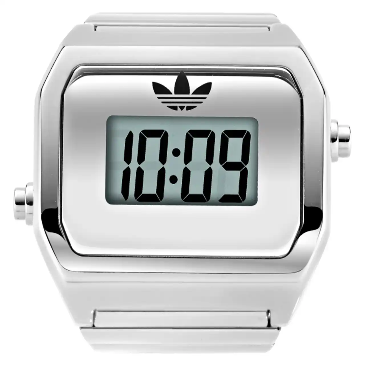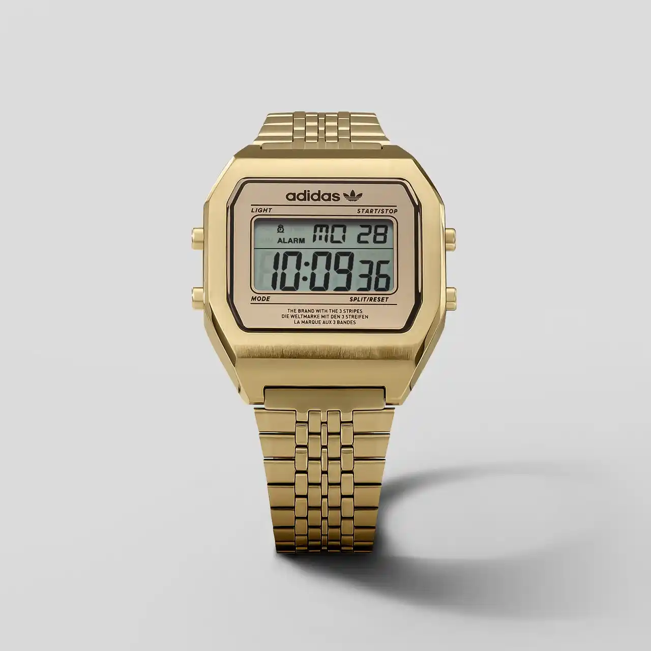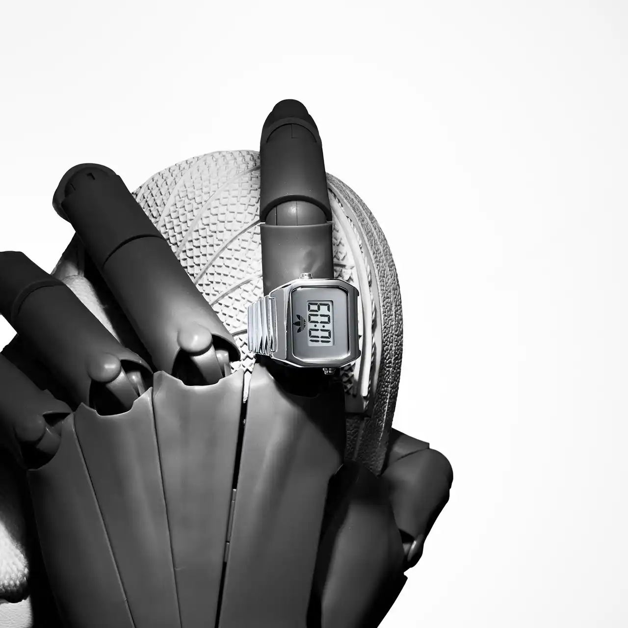 また、デジタルによる時刻表示をシンプルかつ大きくレイアウトし、視認性を最大限確保。アディダス オリジナルスのトレフォイルロゴを載せた以外に、一切装飾していないことでも、時刻を判読しやすくしています。 |