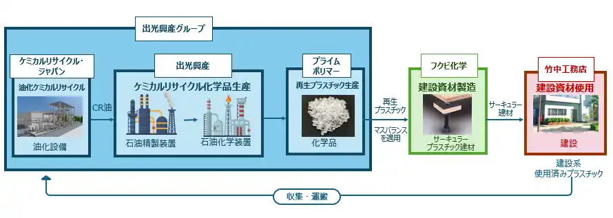 出光興産株式会社(以下「出光興産」)、株式会社竹中工務店(以下「竹中工務店」)、ケミカルリサイクル・ジャパン株式会社(出光興産子会社、以下「CRJ」)、フクビ化学工業株式会社(以下「フクビ化学」)、株式会社プライムポリマー(出光興産関係会社、以下「PRM」)の5社は、廃棄・回収された使用済みプラスチック(ポストコンシューマープラスチック※1)を原料として、マスバランス方式※2を活用した再生プラスチックを製造するとともに、建設資材への活用に成功しました。