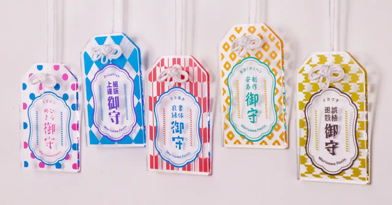 今回は「pixivFACTORY」に提供したフォントを使って、同サービス内のアクリルお守りをオリジナルデザインで制作しました。お守りは、制作に携わる方にとって縁起の良い「ひらめき御守」、組版や文字にまつわるデザインにちなんだ「組版上達御守」など、制作安泰の願いを込めた全5種類です。お守りに記された言葉は当社が遊び心で創作したもので、それぞれの言葉に合うフォントを選んでデザインしました。ぜひ身につけていただき、日々の制作を見守るお守りとしてお楽しみください。 |