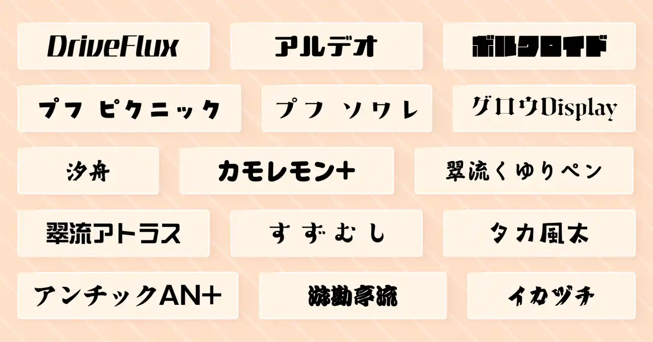 提供するフォントは、力強さやスピード感を細部まで表現できるバリアブルフォント「DriveFlux(ドライブフラックス)」から厳選した7スタイルに加え、「プフ ピクニック」など人気の高いデザイン書体を中心とした計15書体です。個性的なフォントが、オリジナルグッズをより魅力的に演出します。 |