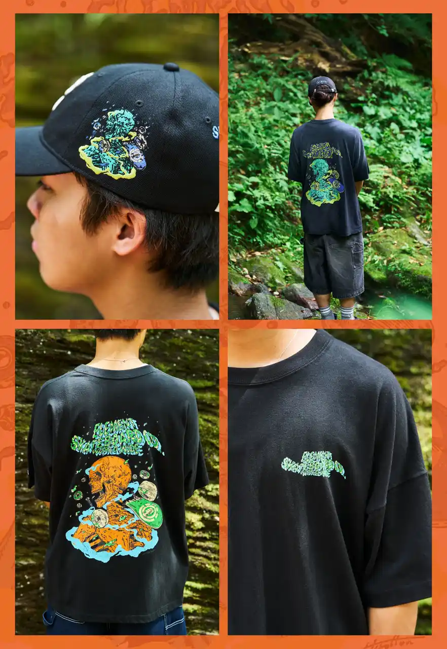 今回のコレクションでは、HIROTTONによるアートワークを落とし込んだTシャツ、スケートデッキ、キャップを展開。 |