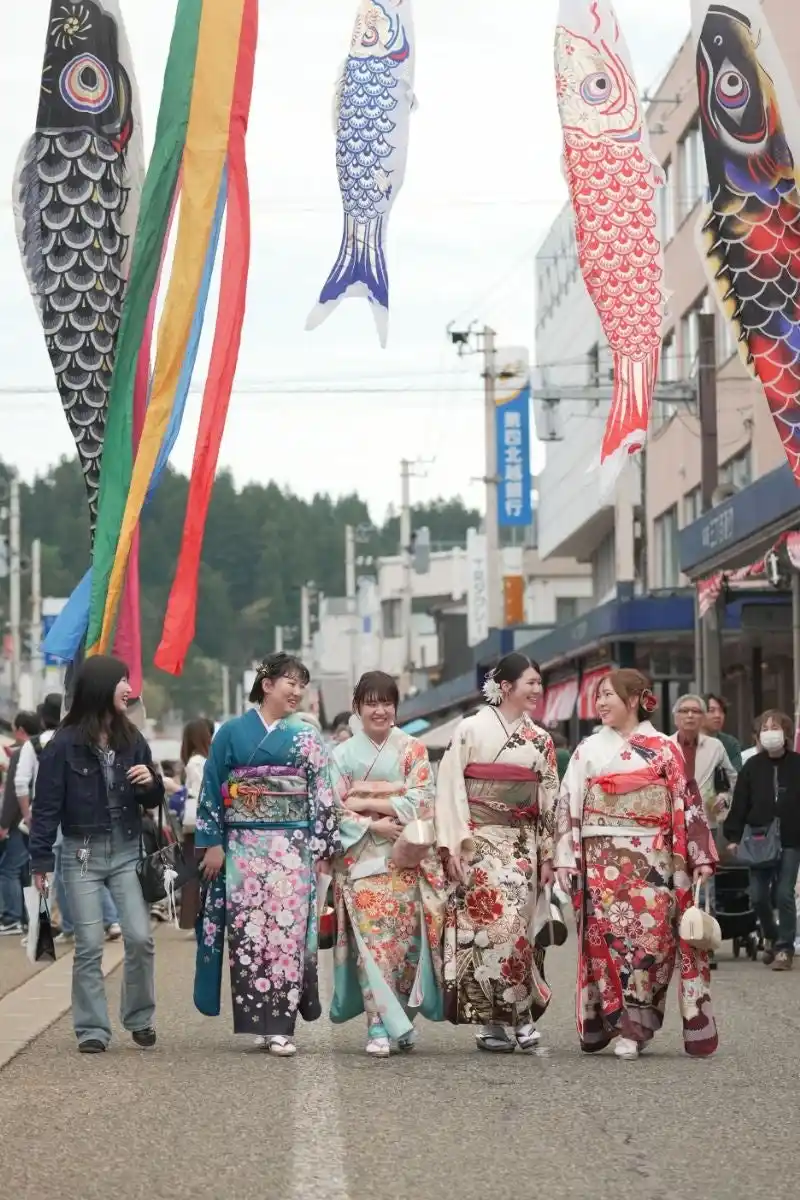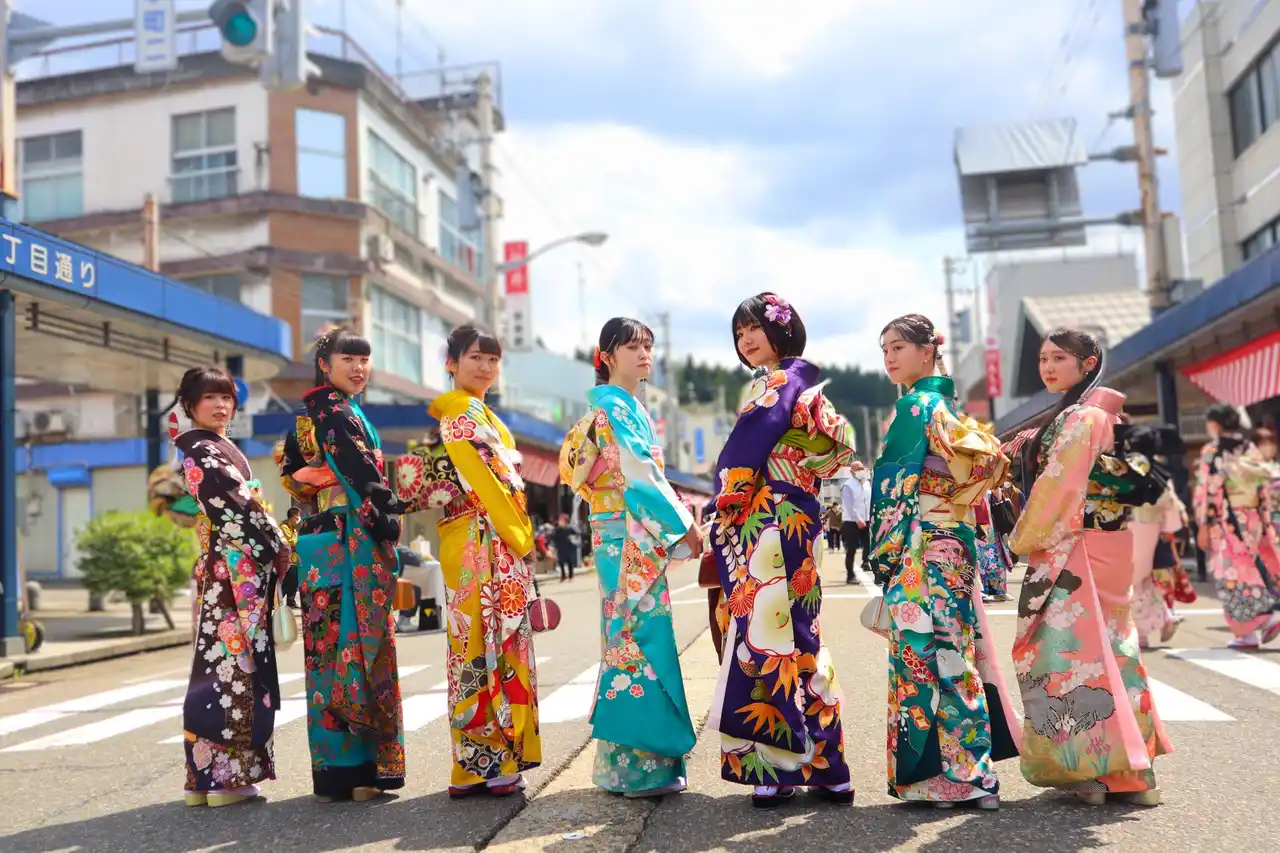 十日町きものまつりは、きものを特別なものとして鑑賞するだけでなく、実際に「着て、歩き、楽しむ」ことができるイベントです。まちなかを歩く人々のきもの姿、二十歳のつどいを迎えた若者たちの晴れ着、地域の伝統行事十三詣りや稚児行列など、この日、十日町のまちは“きもののある日常”そのものに包まれます。 |