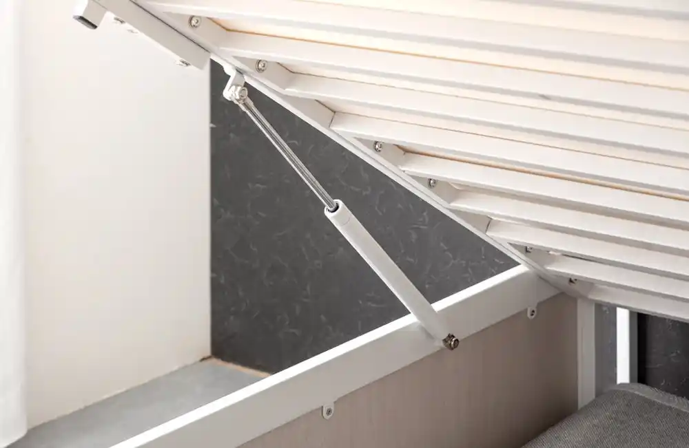 本製品は、スムーズな開閉をサポートする「ガス圧式」を採用しました。これによりマットレスを置いたまま楽に開閉することが可能です。 |