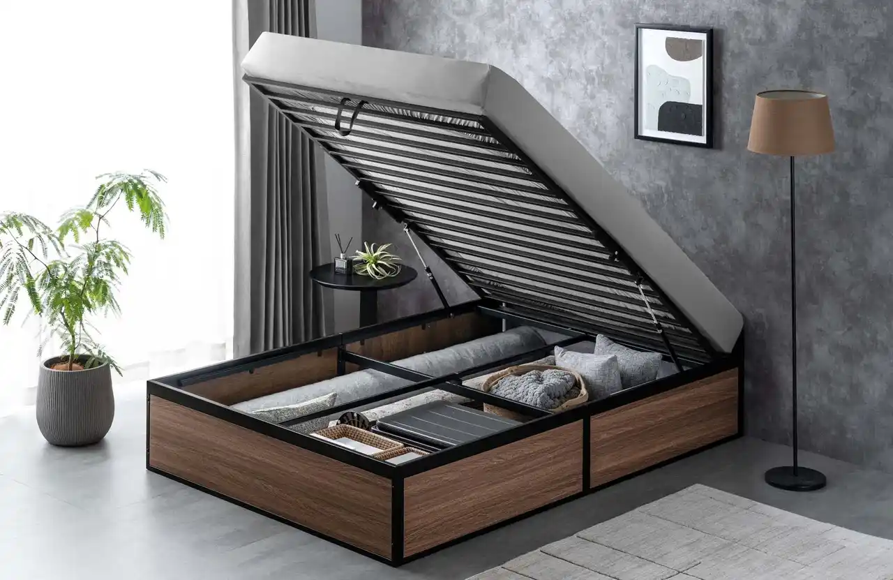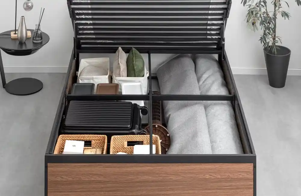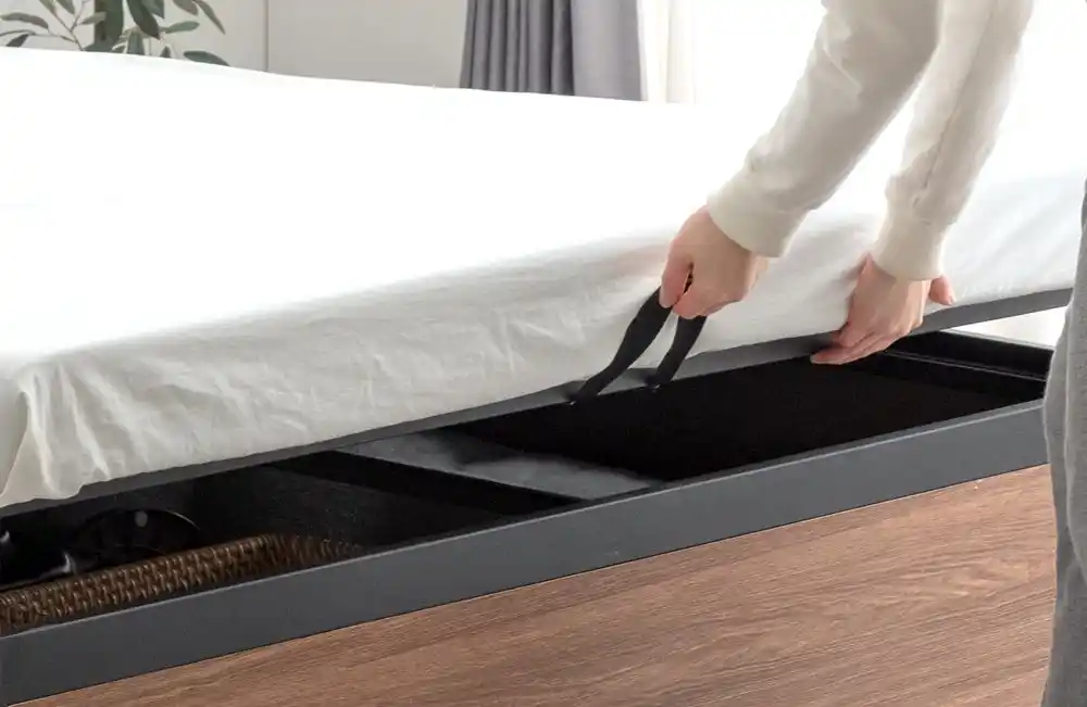 引き出しタイプの収納とは異なり、出し入れのためにベッド横のスペースを確保する必要がありません。ベッドの設置面積だけで出し入れが完結する省スペース仕様となっているため、ワンルームなどの限られた空間においてもスぺパを最大化し、お部屋を広く使うことができます。 |