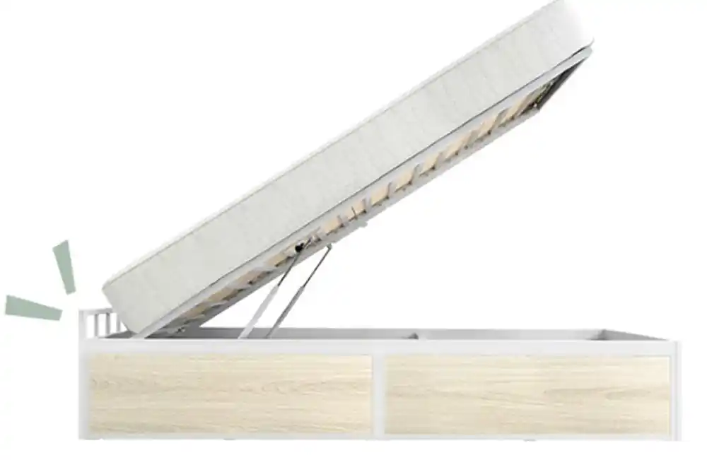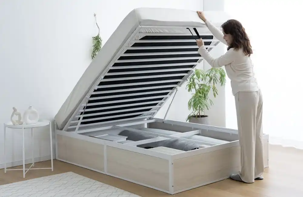 床板を持ち上げて開閉するため、引き出しを引くための余分なスペースを確保する必要がなく、ベッドの設置面積だけで大容量の収納スペースを確保することが可能です。 |