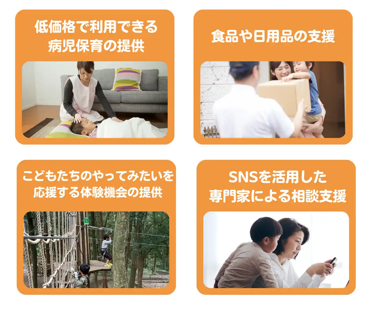 従来の訪問型病児保育事業「寄付によるひとり親支援プラン」に加え、新たに「食品支援」「相談支援」「体験提供」も対象となります。 |