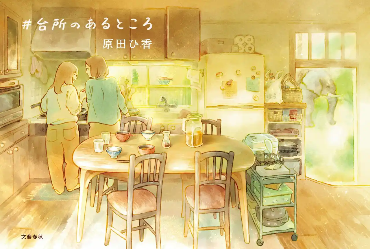 | システムキッチンで料理をする2人の女性、大きな木の食卓、窓の外のゾウ...作中に登場するモチーフが細やかに描かれた装画が完成しました。 | ||||||||||