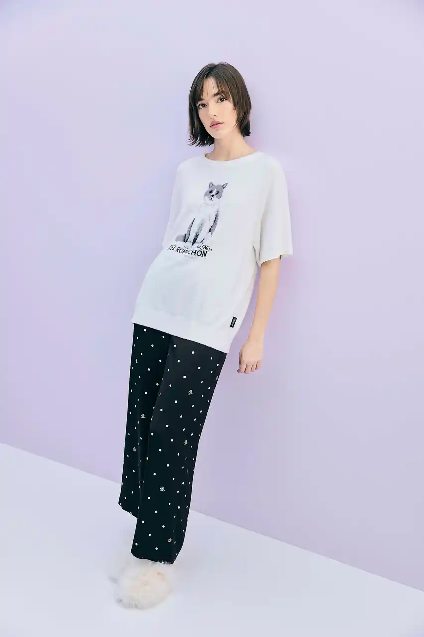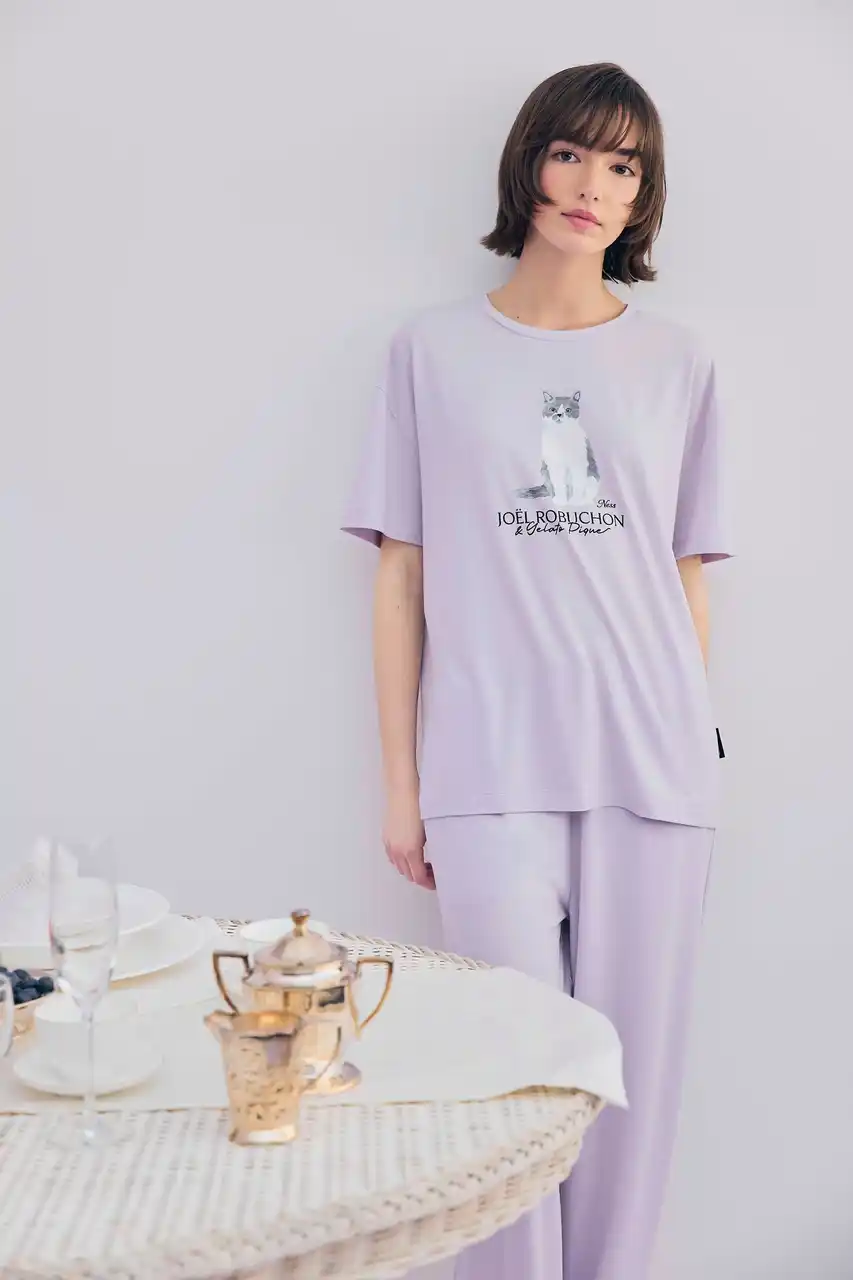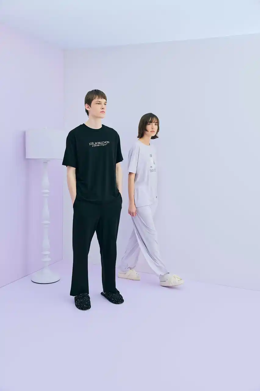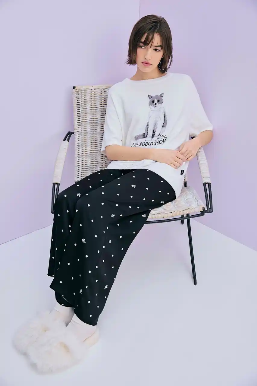 ひんやりとした感触が長時間続く素材「ICEDFABRIC+(R)」を使用したカットソーシリーズ。 ジョエル・ロブション氏の愛猫“NESS”をワンポイントであしらったなめらかな肌触りのプリントTシャツのほか、ミニマルなロゴプリントをデザインしたアイテムがラインアップいたします。ゆったりとしたシルエットのロングパンツに加え、お部屋でさらっと1枚で着用できるワンピースも登場。 |