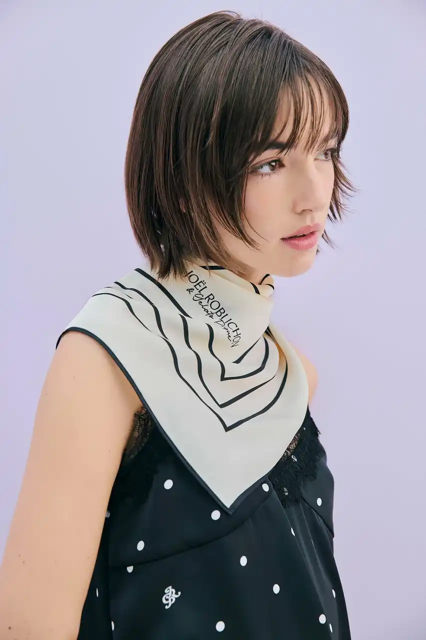 夏らしい上品なドット柄にロゴを配したトレンド感のある総柄デザインです。キャミソールは胸元に生地と同色のレースをあしらい、フェミニンな印象に仕上げました。ラインとロゴプリントが入った、柔らかなオフホワイトが夏の装いにもぴったりなスカーフも登場。首元に巻いたりヘアアレンジにプラスしたり、バッグにも結べるサイズ感で、幅広いシーンでコーディネートに取り入れていただけます。 |