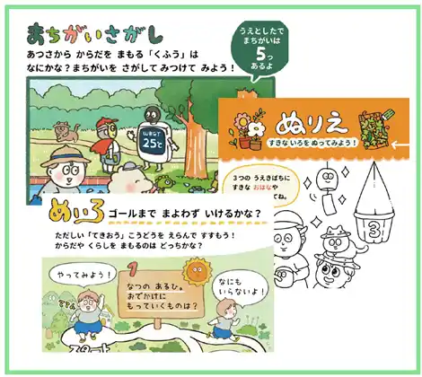 こども版『A-PLAT BOOK KIDS』には「間違い探し」「ぬりえ」「めいろ」等を随所に取り入れ、小さなお子様が楽しみながら気候変動の適応アクションへの理解を深められるよう工夫。 |