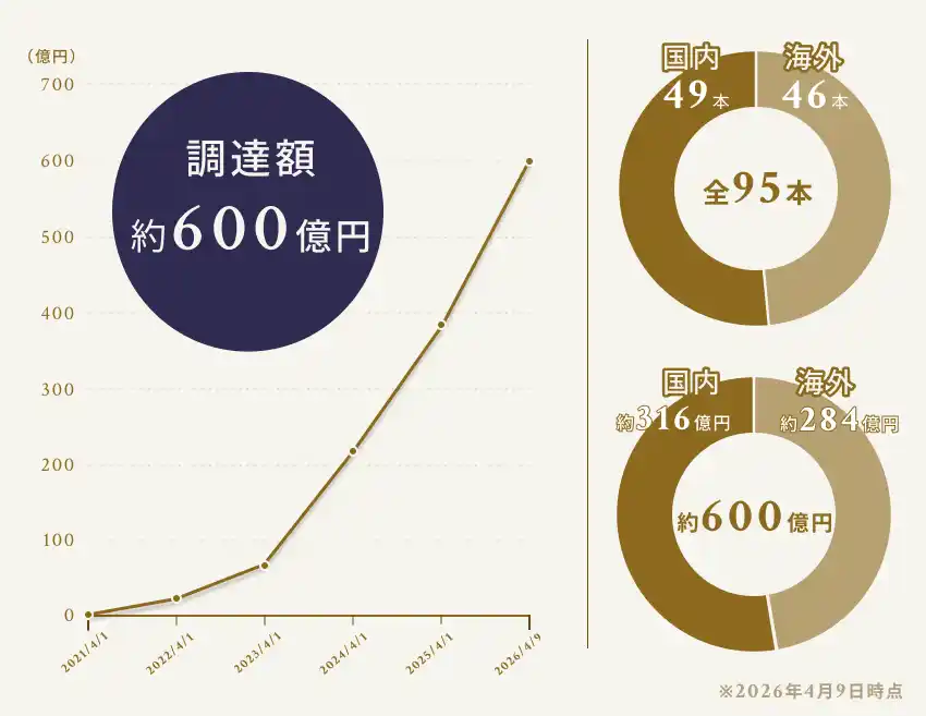 リリースから1年で累計調達額25億円、2年で80億円、5年で500億円を突破し、今回の95号ファンドをもって累計600億円を超えるに至りました。 |