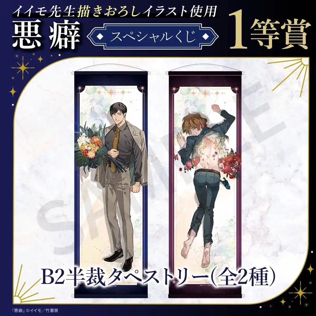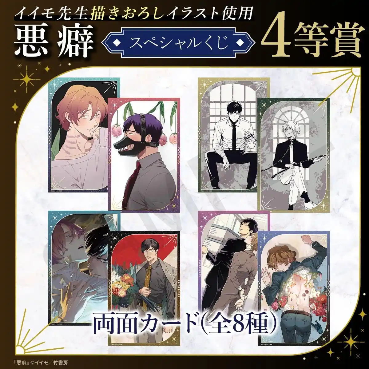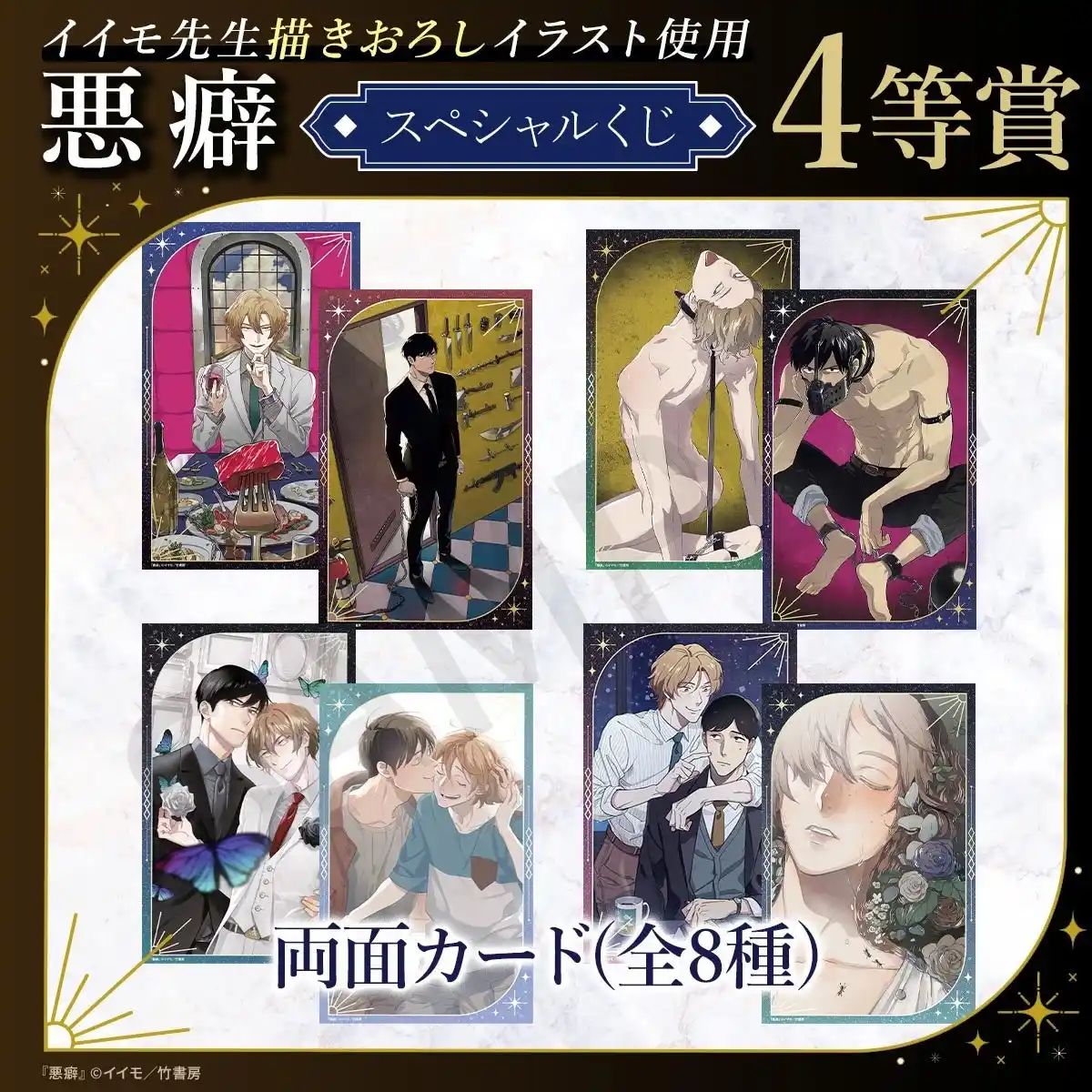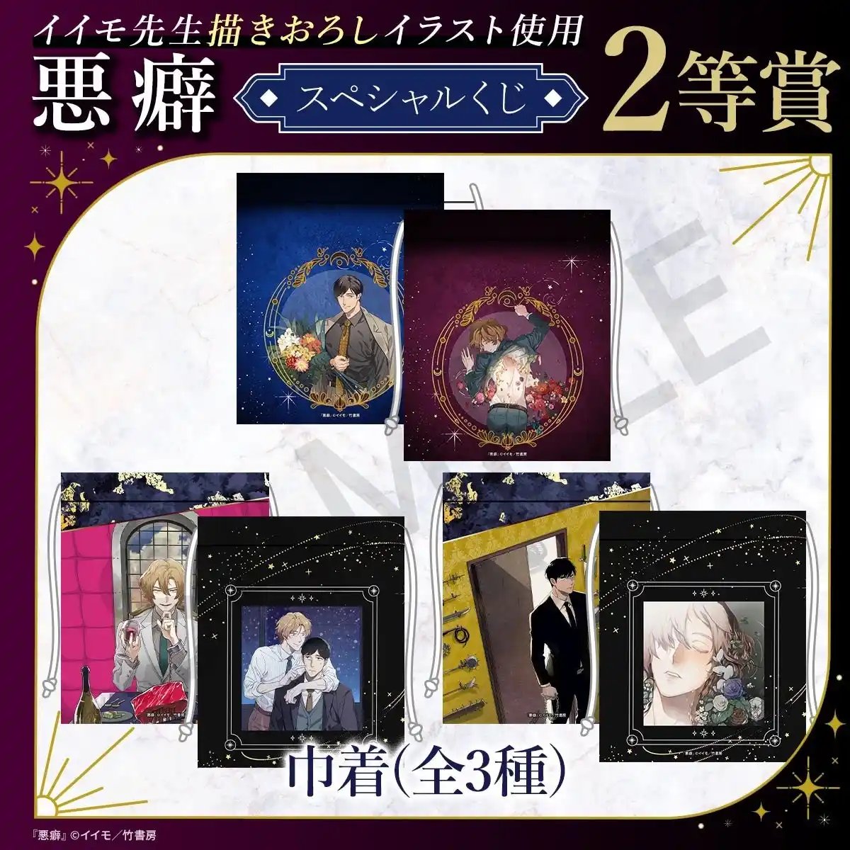 イイモ先生による大人気BL作品『悪癖』のスペシャルくじが登場!本くじのために描きおろされた美麗イラストをはじめ、コミックスの表紙イラストなどを使用した豪華なオリジナルグッズが多数ラインナップされています。 |