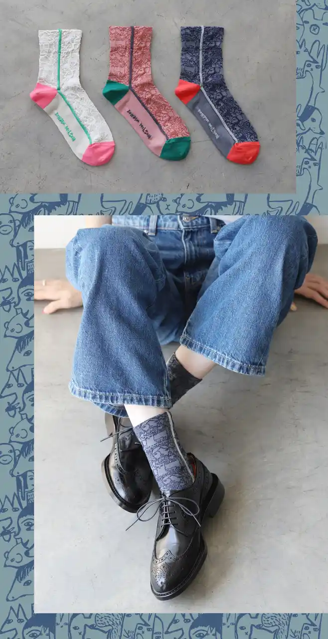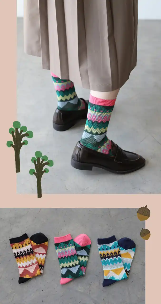 ヒトや様々な動物が表現されたパターン。配色によって柄の印象がガラリと変わるほか、サイドのラインやつま先・かかとのカラーリングがコーディネートのアクセントになります。 |