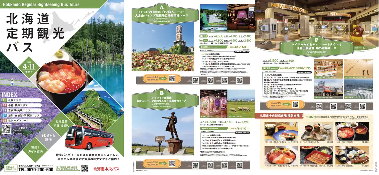 | 北海道中央バス・札幌ターミナルや札幌駅北口にある「北海道さっぽろ観光案内所」などで配布するほか、電子版も用意しております。 | ||||||||||||||