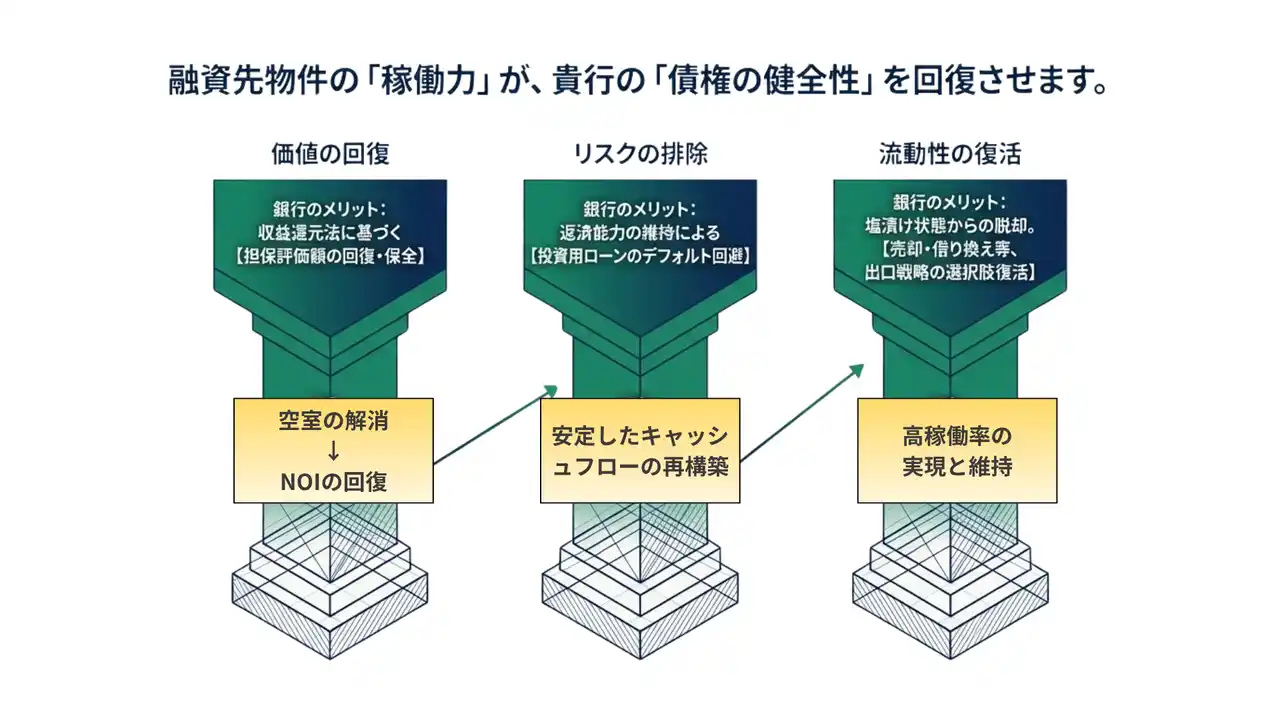 融資先物件の稼働力が回復することで、金融機関の債権健全性は以下の3点で改善されます。 |