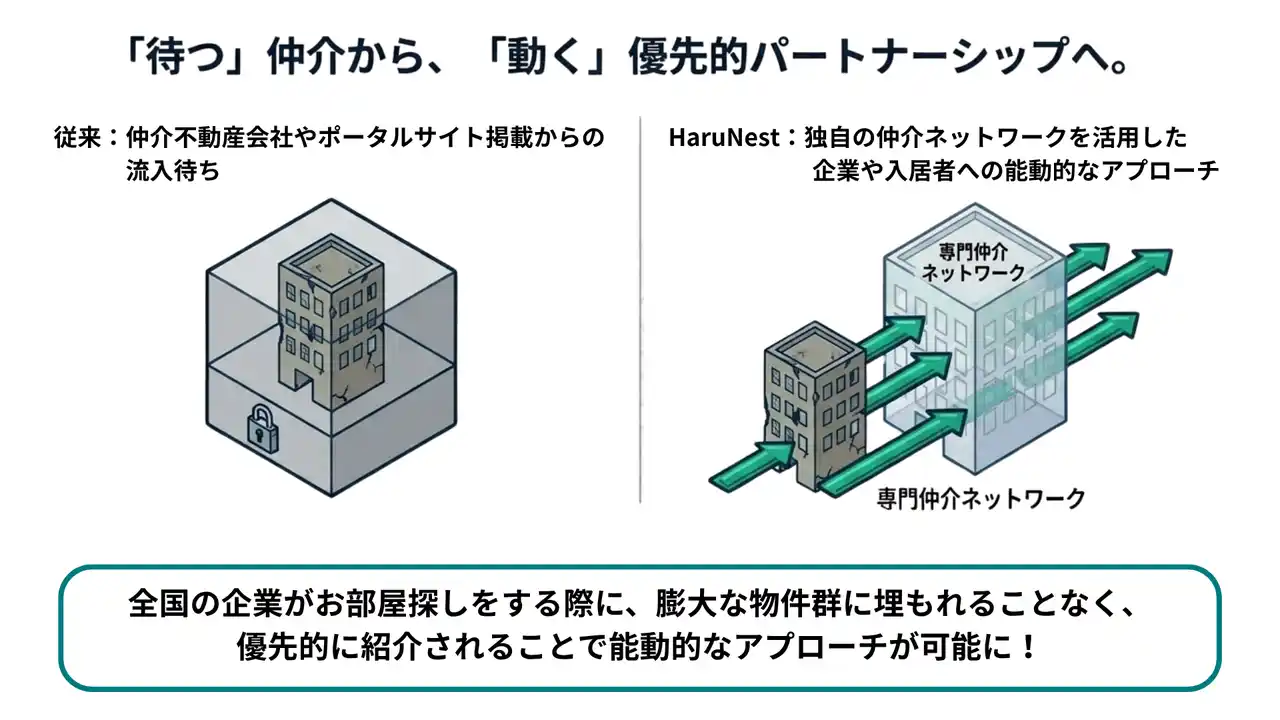 2.HaruNestの提供しているサービスを利用している全国の企業へ、優先して当該オーナーの既存物件を紹介させていただきます。 |
