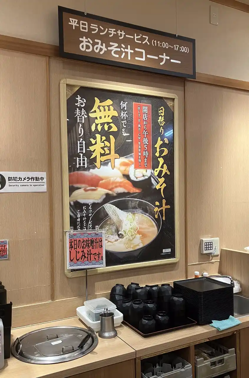 | 平日の月曜日~金曜日は17時まで、おみそ汁無料コーナーを設置。日替わりの熱々のおみそ汁を何杯でも無料でお楽しみいただけますのでお客様から大変ご好評をいただいております。 | |||||||||||||
