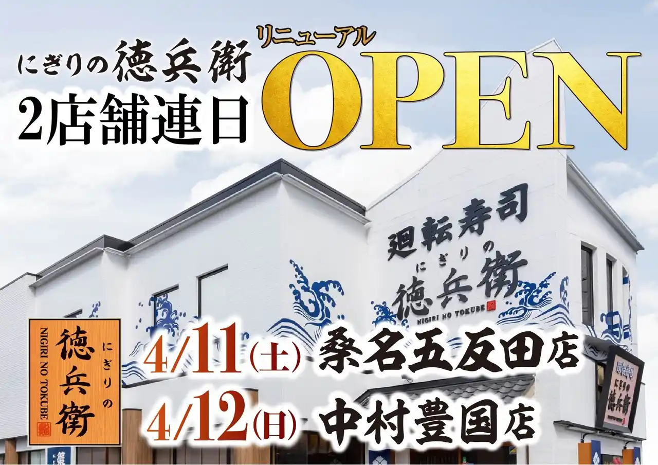 2026年4月11日(土)に三重県桑名市の「にぎりの徳兵衛 桑名五反田店」を、 2026年4月12日(日)に愛知県名古屋市の「にぎりの徳兵衛 中村豊国店」をリニューアルオープンいたします。