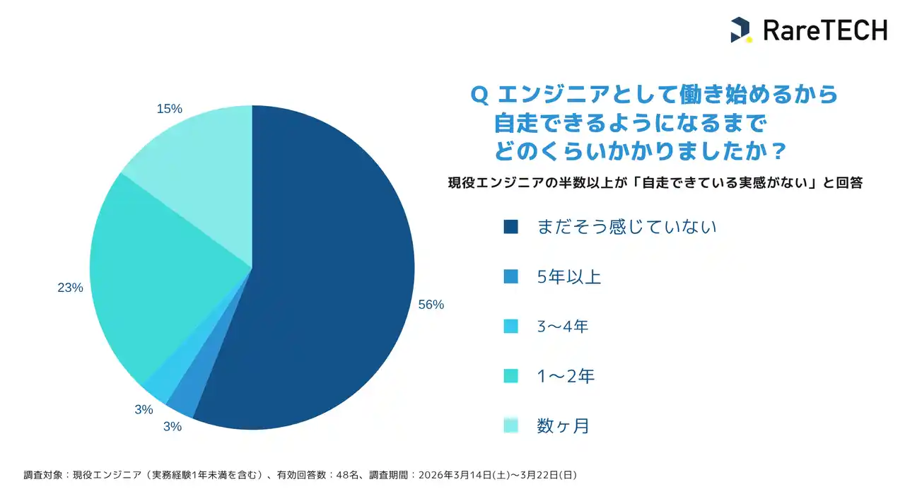 実際に、RareTECHが実施したアンケート調査では、現役エンジニアの56%が「自走できている実感がない」と回答しており、エンジニアとして自走できるレベルに到達するためには、長期間にわたる継続的な学習が不可欠であり、短期間の学習のみでは十分なスキル習得に至らないと考える人が多いことがわかりました。 |