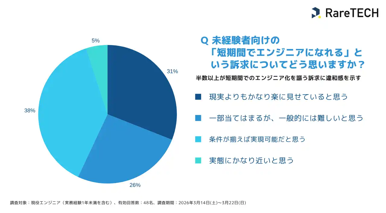 半数以上が短期間でのエンジニア化を謳う訴求に違和感を示す一方、実態に近いと回答したのはわずか5%にとどまりました。 |