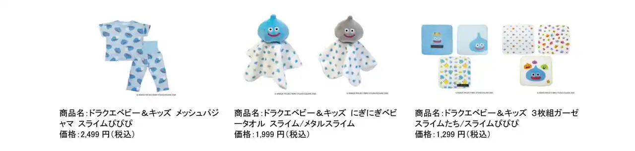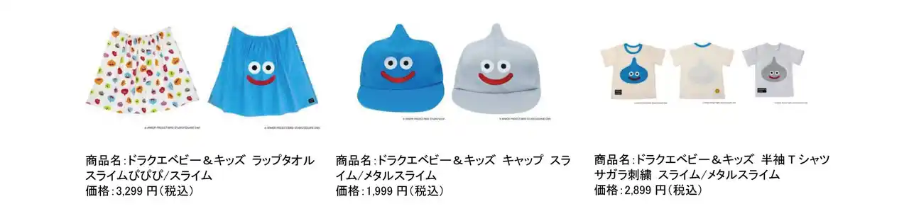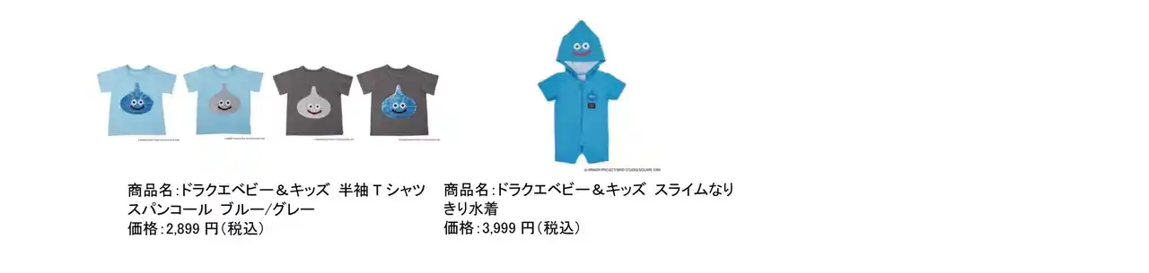今回販売する新商品は、2024年9月の発売以来、好評を博している同ブランドのベビー・キッズウェアです。これまで人気だったロンパースやトップス、ボトムスに加え、夏に活躍するスイムウェアを着ぐるみタイプやラッシュガードとして展開します。さらに、キャップやハットなどの小物から洋服まで、夏を楽しく過ごせるラインナップになっています。人気絵本「スライムぴぴぴ」のキャラクターをあしらった総柄アイテムも新登場し、「ドラクエベビー&キッズ」のウエアを装備して、冒険気分をお楽しみください。