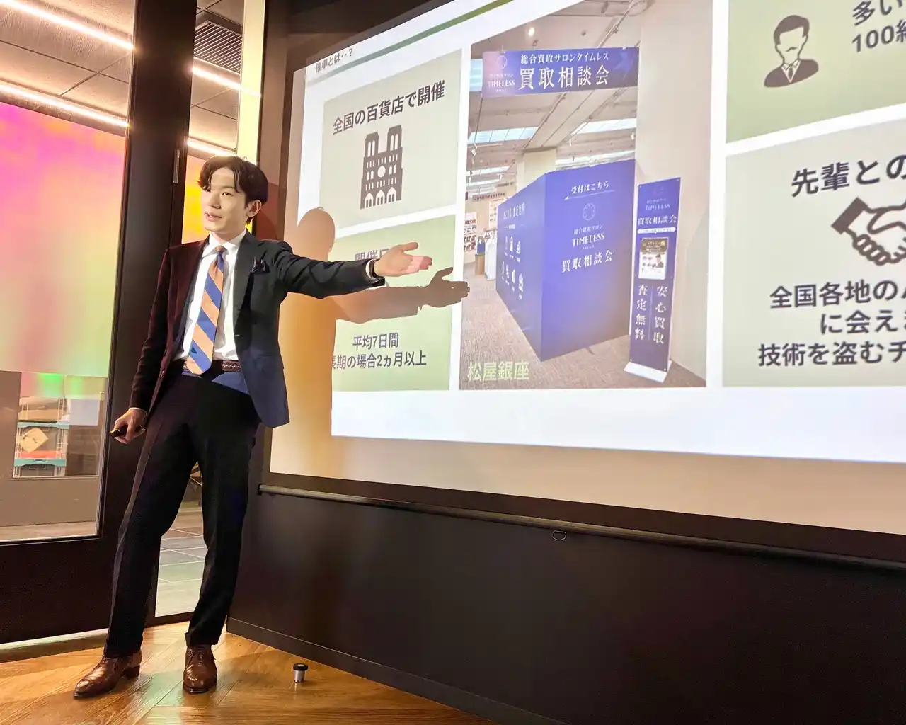 弊社会社紹介のあと、代表取締役社長の馬場からも「一緒にタイムレスを盛り上げたい」といった言葉があり、timeleszメンバーからも「ありがたい」といった反応もありました。その後は弊社が査定した想定金額を基に「timeleszオークションプロジェクト」企画が実施されました。総合買取サロンタイムレスの店舗を運営する、店舗営業部部長の岡根を中心にtimeleszメンバーのお品物を査定し、協力させていただきました。 |